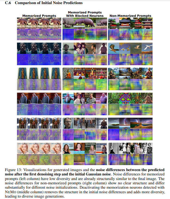 - For prompts that the model has memorized (i.e., those likely to reproduce near‐verbatim training data), the early noise predictions tend to follow nearly the same denoising path from one random seed to another. In contrast, non‐memorized prompts show more variation in those initial denoising steps.