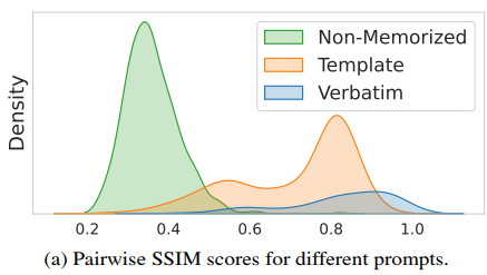 - Thresholding: By looking at the SSIM scores for multiple prompts, they define a “memorization threshold” \(\tau_{\text{mem}}\) . Prompts whose SSIM scores exceed this threshold (i.e., very high consistency across seeds) are labeled as memorized.