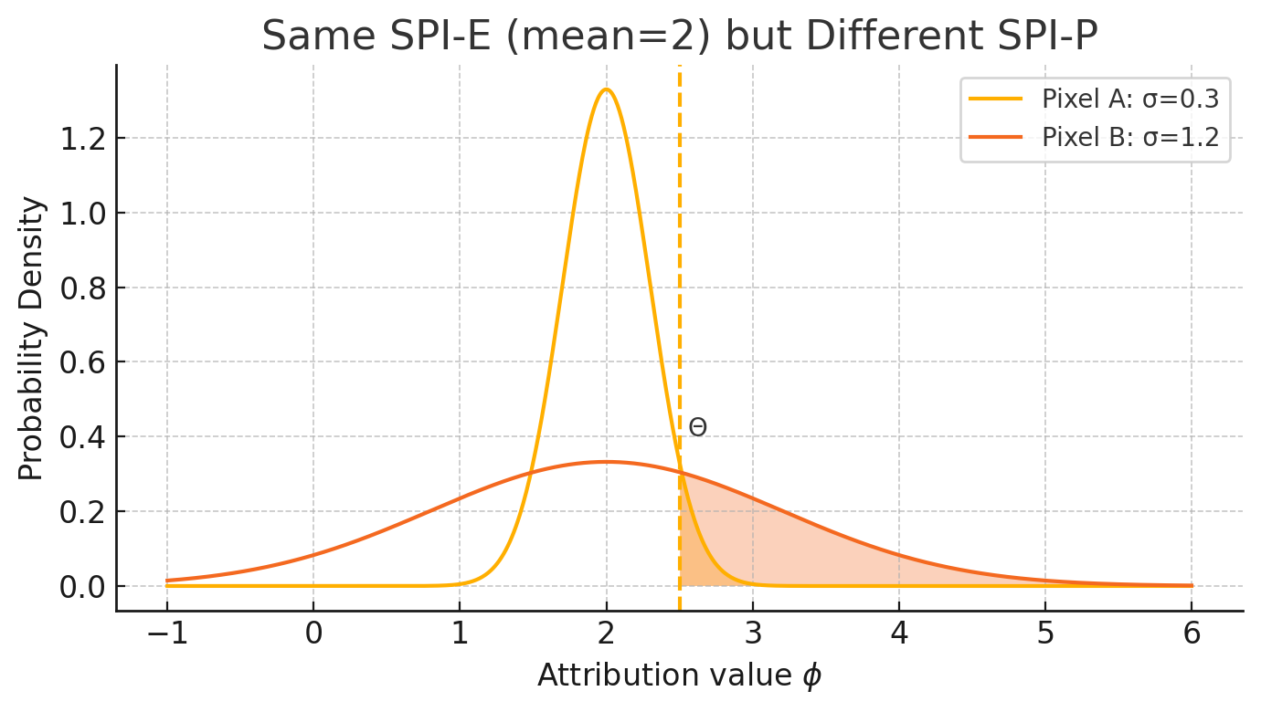 Pixel \(\mu\) \(\sigma\) SPI-E A \(2.0\) \(0.3\) \(2.0\) B \(2.0\) \(1.2\) \(2.0\) Although the two pixels share the same expected attribution (2.0), pixel B’s broader distribution lets it cross \(\Theta\) more often, so SPI-P marks B as “more likely to matter” while down-weighting A.
