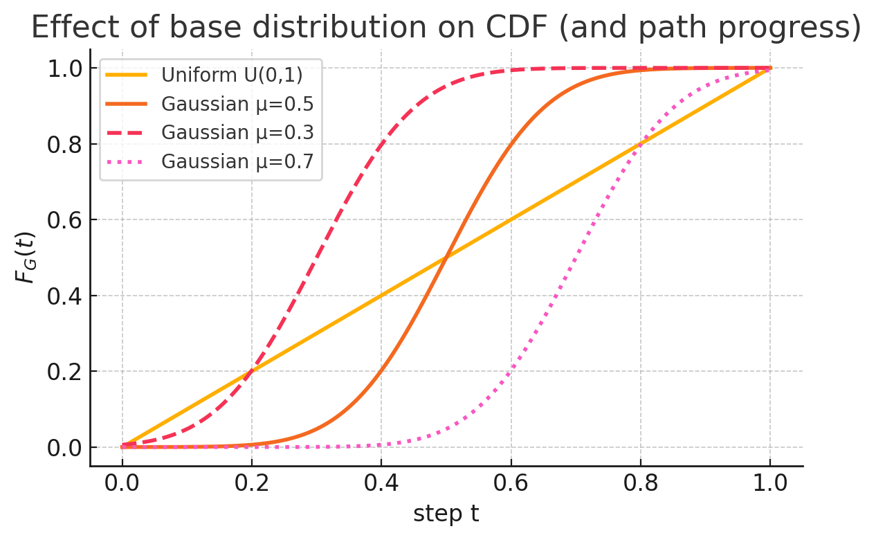 This illustrates why selecting Gaussian base distributions with different means lets us steer the path toward faster motion early, in the middle, or late in the integration interval.