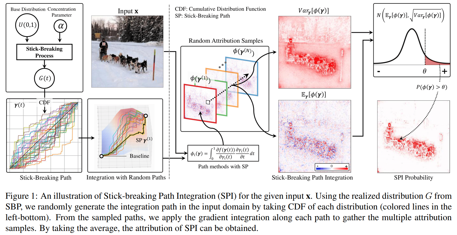 - For a model \(f\) , an input \(\mathbf x\) , and a baseline \(\bar{\mathbf x}\) , let each feature–wise path be driven by a stick‑breaking process \(G_i\sim\text{SBP}(U(0,1),\alpha)\) with CDF \(F_{G_i}(t)\) . Then the SPI attribution for feature \(i\) is the expectation of Integrated Gradients over that path distribution: